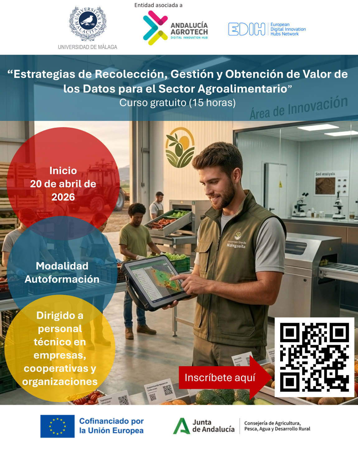 El curso «Estrategias de recolección y gestión de datos para la obtención de valor en el sector agroalimentario» pretende proporcionar al personal técnico de cooperativas, grandes explotaciones agrarias y empresas agroalimentarias de los conocimientos y competencias necesarios para comprender, aplicar y mejorar las estrategias de recolección y gestión de datos en el contexto del sector agroalimentario, con el fin de obtener valor a partir de los mismos y apoyar la toma de decisiones técnicas y organizativas.Cuándo: Del 20-04-26 al 01-05-2026