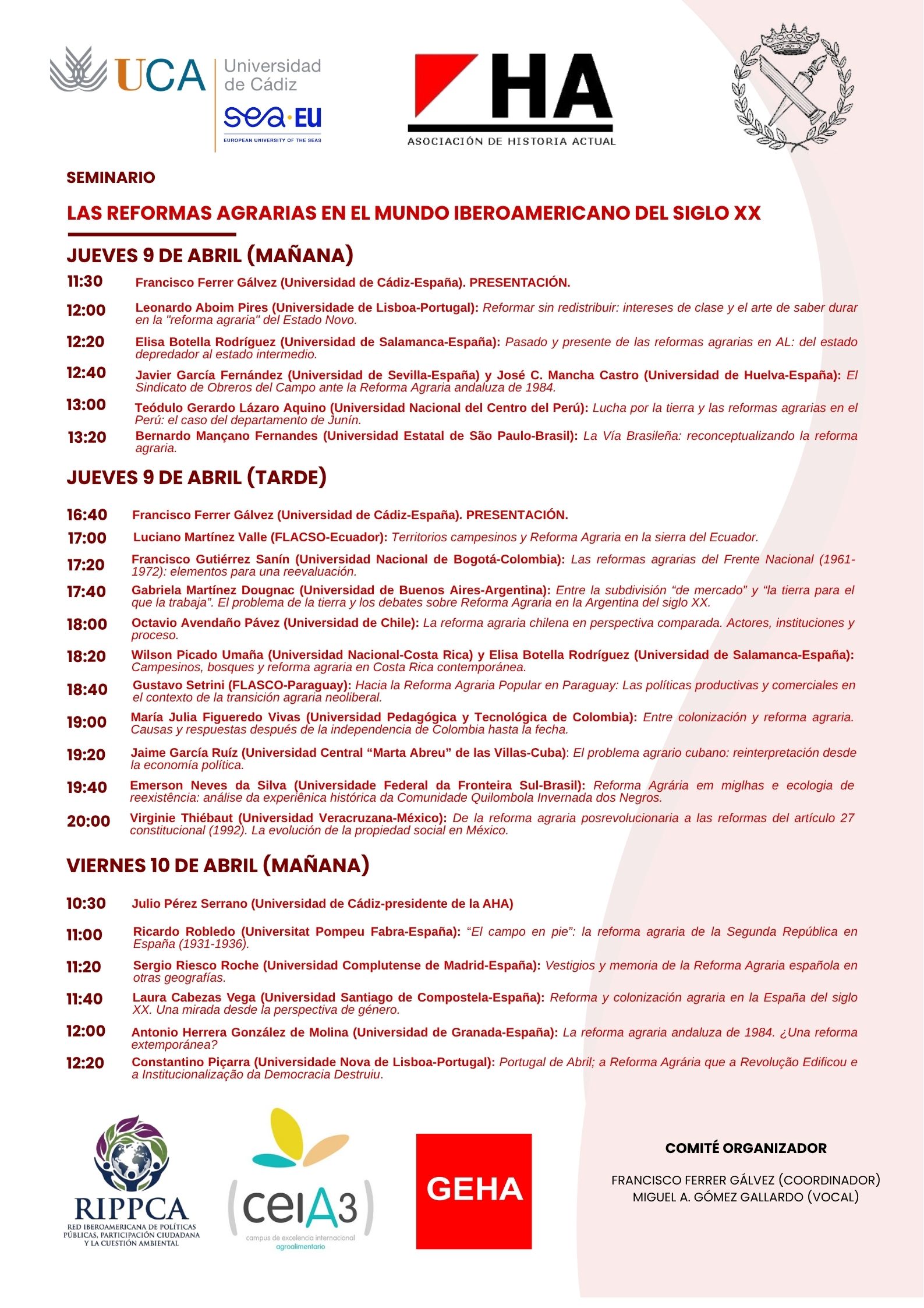 Este evento cuenta con el respaldo institucional de la Universidad de Cádiz (UCA), la propia AHA, el Grupo de Estudios de Historia Actual (GEHA), la red RIPPCA (Red Iberoamericana de Políticas Públicas, Participación Ciudadana y la Cuestión Ambiental) y el Ceia3 (Campus de Excelencia Internacional Agroalimentario). Las sesiones se transmitirán en vivo, permitiendo una conexión directa con expertos de primer nivel para reflexionar sobre el pasado y presente de la cuestión agraria.