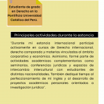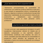 ¿Qué destacarías de la experiencia? Destacaría principalmente la posibilidad de interactuar con sistemas jurídicos distintos al peruano, lo que amplió mi perspectiva crítica y comparada del Derecho. Además, el entorno multicultural me permitió desarrollar habilidades de comunicación intercultural, autonomía y adaptación, que considero fundamentales tanto a nivel personal como profesional.