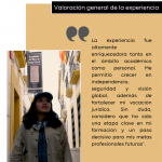 Valoración general de la experiencia: La experiencia fue altamente enriquecedora tanto en el ámbito académico como personal. Me permitió crecer en independencia, seguridad y visión global, además de fortalecer mi vocación jurídica. Sin duda, considero que ha sido una etapa clave en mi formación y un paso decisivo para mis metas profesionales futuras.