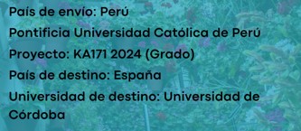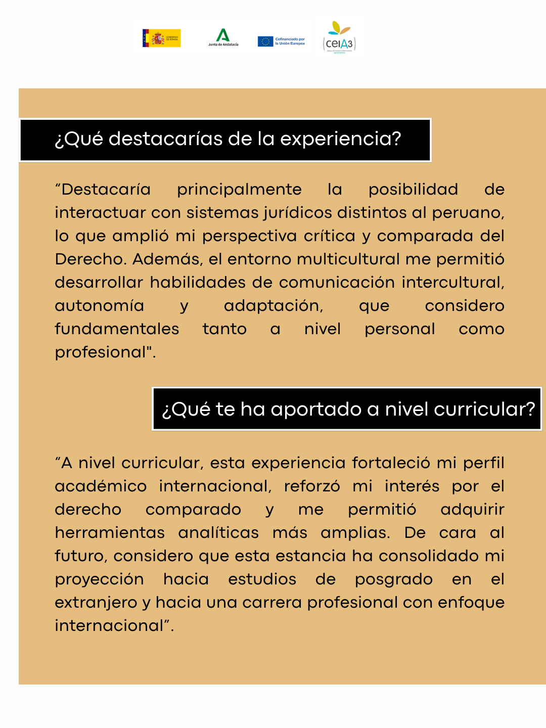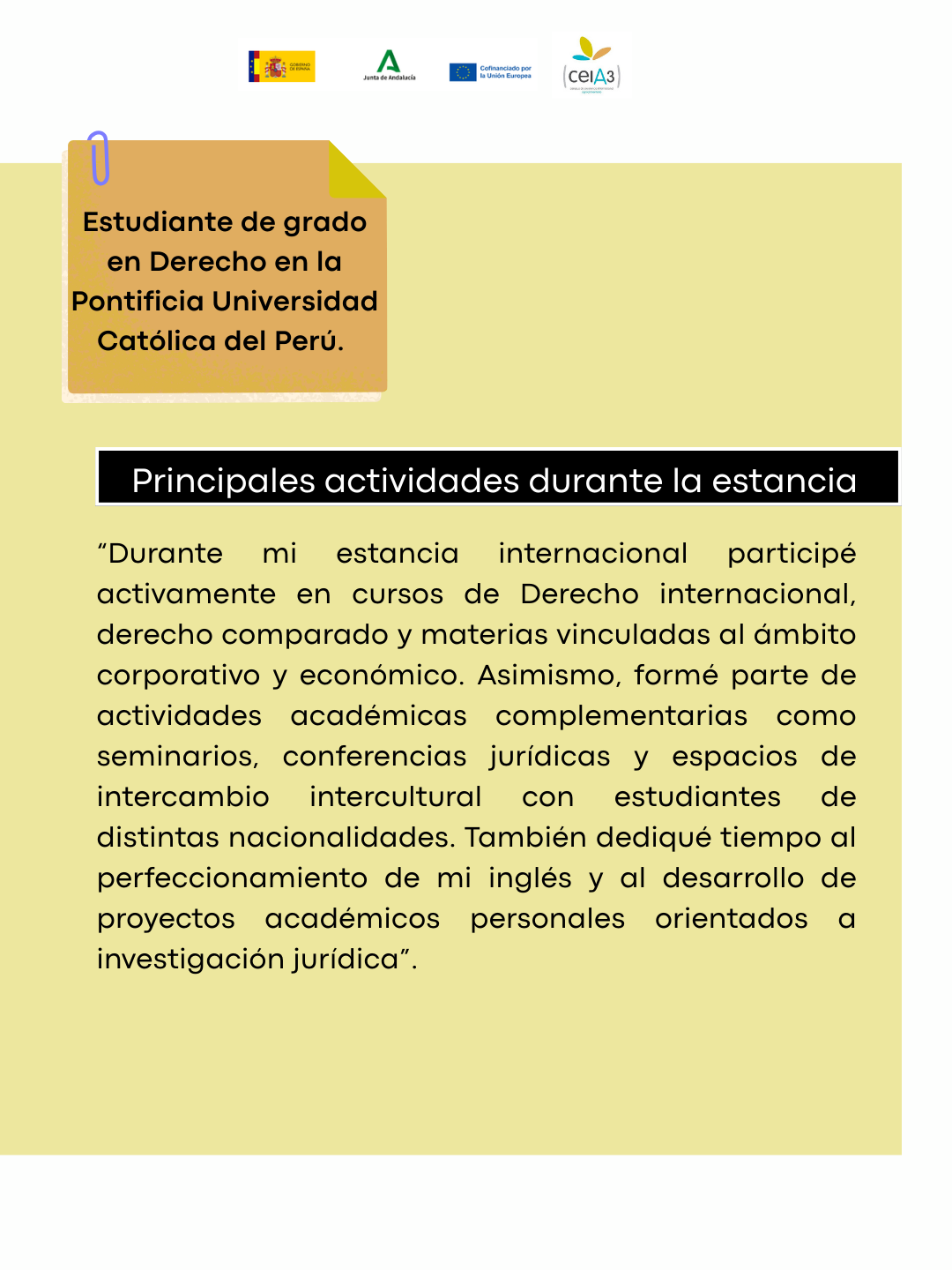 ¿Qué destacarías de la experiencia? Destacaría principalmente la posibilidad de interactuar con sistemas jurídicos distintos al peruano, lo que amplió mi perspectiva crítica y comparada del Derecho. Además, el entorno multicultural me permitió desarrollar habilidades de comunicación intercultural, autonomía y adaptación, que considero fundamentales tanto a nivel personal como profesional.