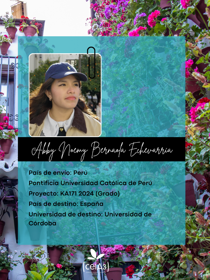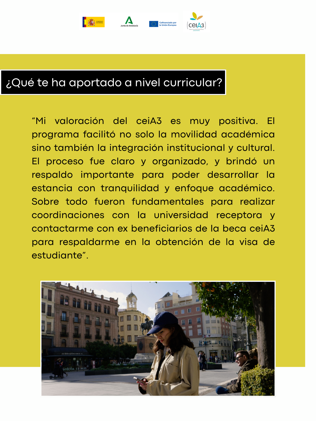 ¿Qué valoración harías sobre el ceiA3? Mi valoración del ceiA3 es muy positiva. El programa facilitó no solo la movilidad académica sino también la integración institucional y cultural. El proceso fue claro y organizado, y brindó un respaldo importante para poder desarrollar la estancia con tranquilidad y enfoque académico. Sobre todo fueron fundamentales para realizar coordinaciones con la universidad receptora y contactarme con ex beneficiarios de la beca ceiA3 para respaldarme en la obtención de la visa de estudiante.