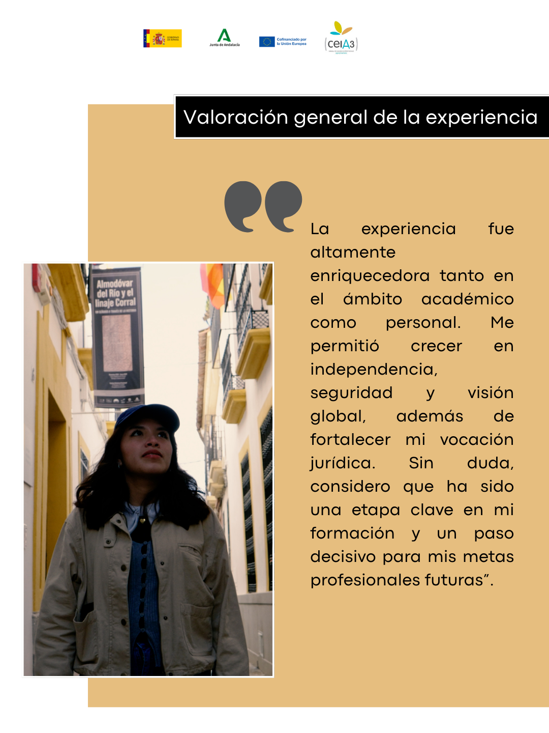 Valoración general de la experiencia: La experiencia fue altamente enriquecedora tanto en el ámbito académico como personal. Me permitió crecer en independencia, seguridad y visión global, además de fortalecer mi vocación jurídica. Sin duda, considero que ha sido una etapa clave en mi formación y un paso decisivo para mis metas profesionales futuras.