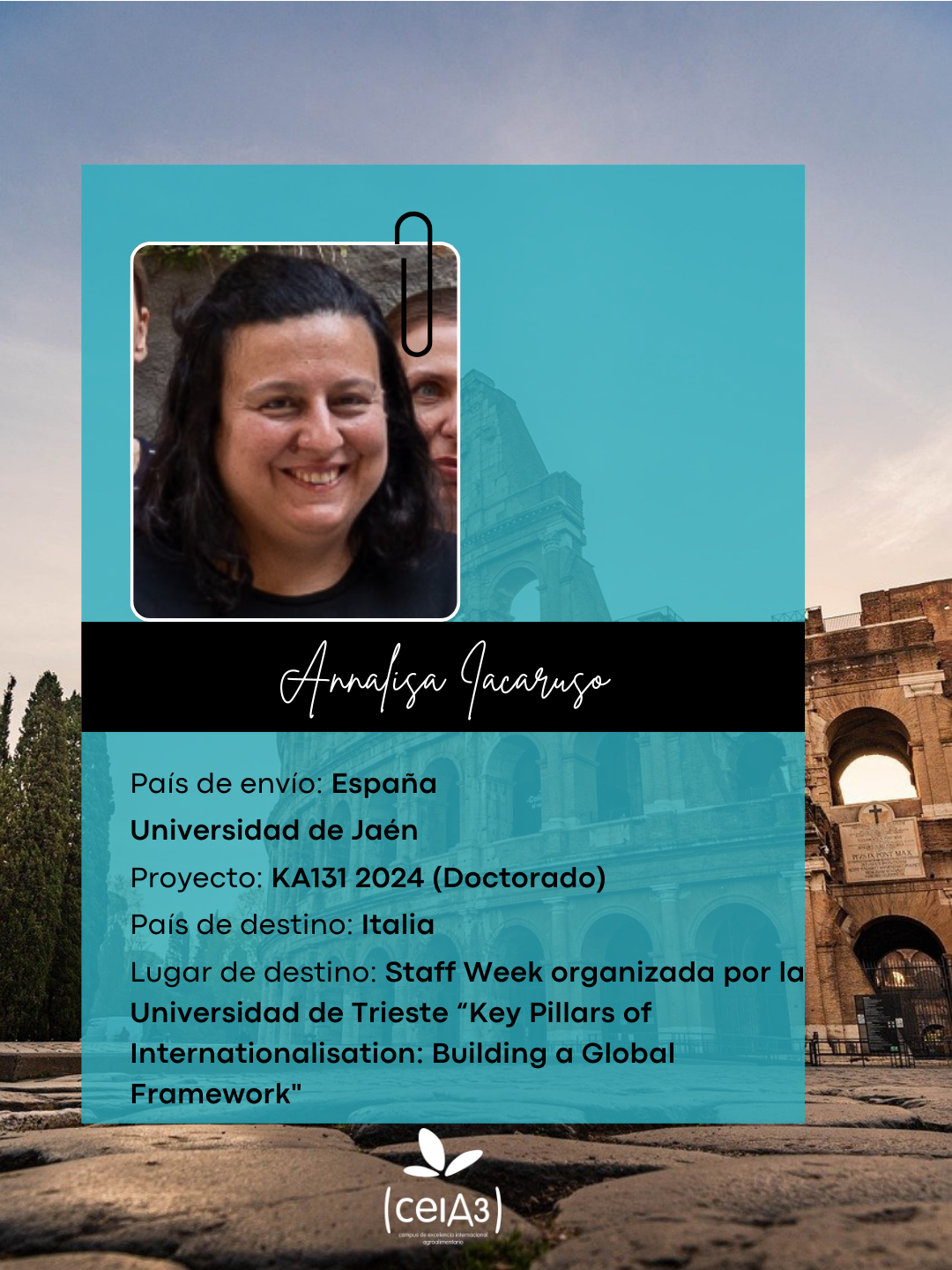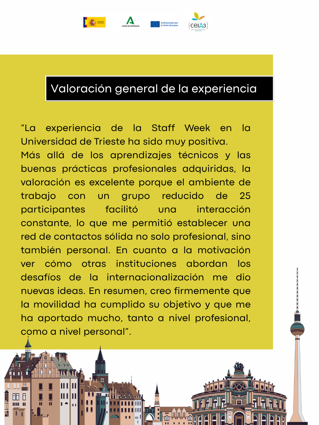 Valoración general de la experiencia: La experiencia de la Staff Week en la Universidad de Trieste ha sido muy positiva. Más allá de los aprendizajes técnicos y las buenas prácticas profesionales adquiridas, la valoración es excelente porque el ambiente de trabajo con un grupo reducido de 25 participantes facilitó una interacción constante, lo que me permitió establecer una red de contactos sólida no solo profesional, sino también personal. En cuanto a la motivación ver cómo otras instituciones abordan los desafíos de la internacionalización me dio nuevas ideas. En resumen, creo firmemente que la movilidad ha cumplido su objetivo y que me ha aportado mucho, tanto a nivel profesional, como a nivel personal.