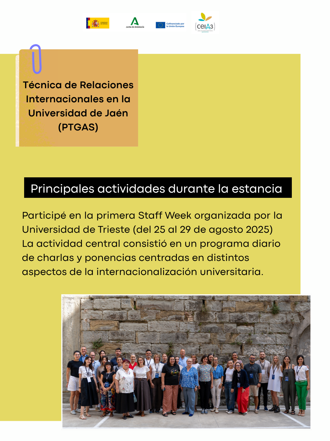 Principales actividades durante la estancia: Participé en la primera Staff Week organizada por la Universidad de Trieste (del 25 al 29 de agosto 2025) y la actividad central consistió en un programa diario de charlas y ponencias centradas en distintos aspectos de la internacionalización universitaria. Aquí un enlace donde se puede encontrar la agenda: https://portale.units.it/en/international/destination-units/staff-week-erasmus