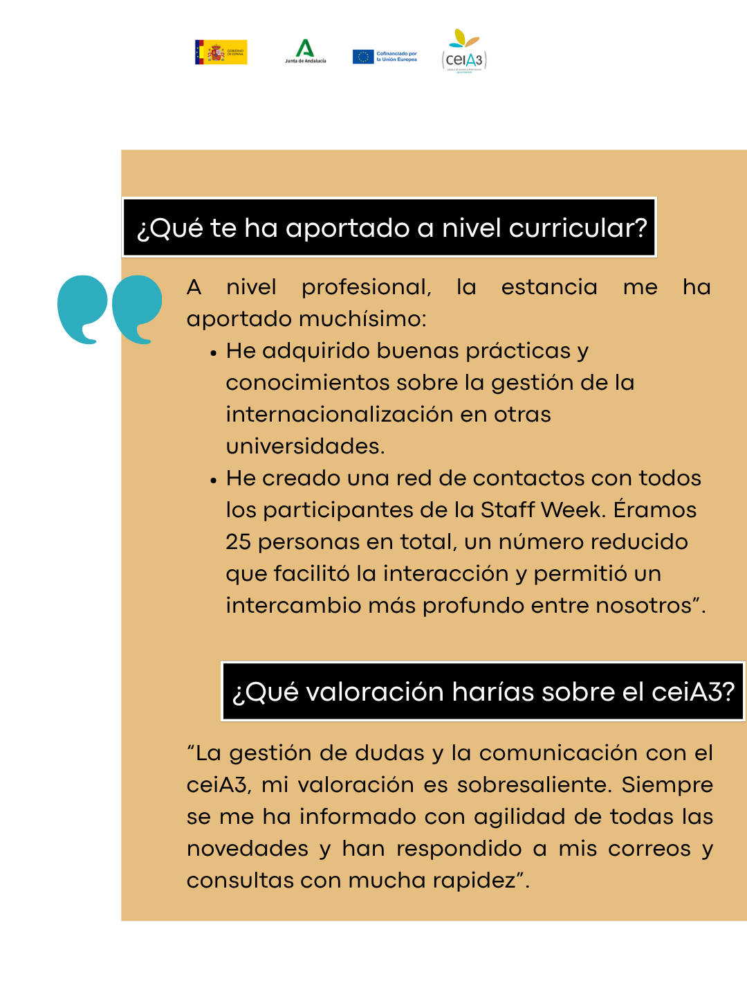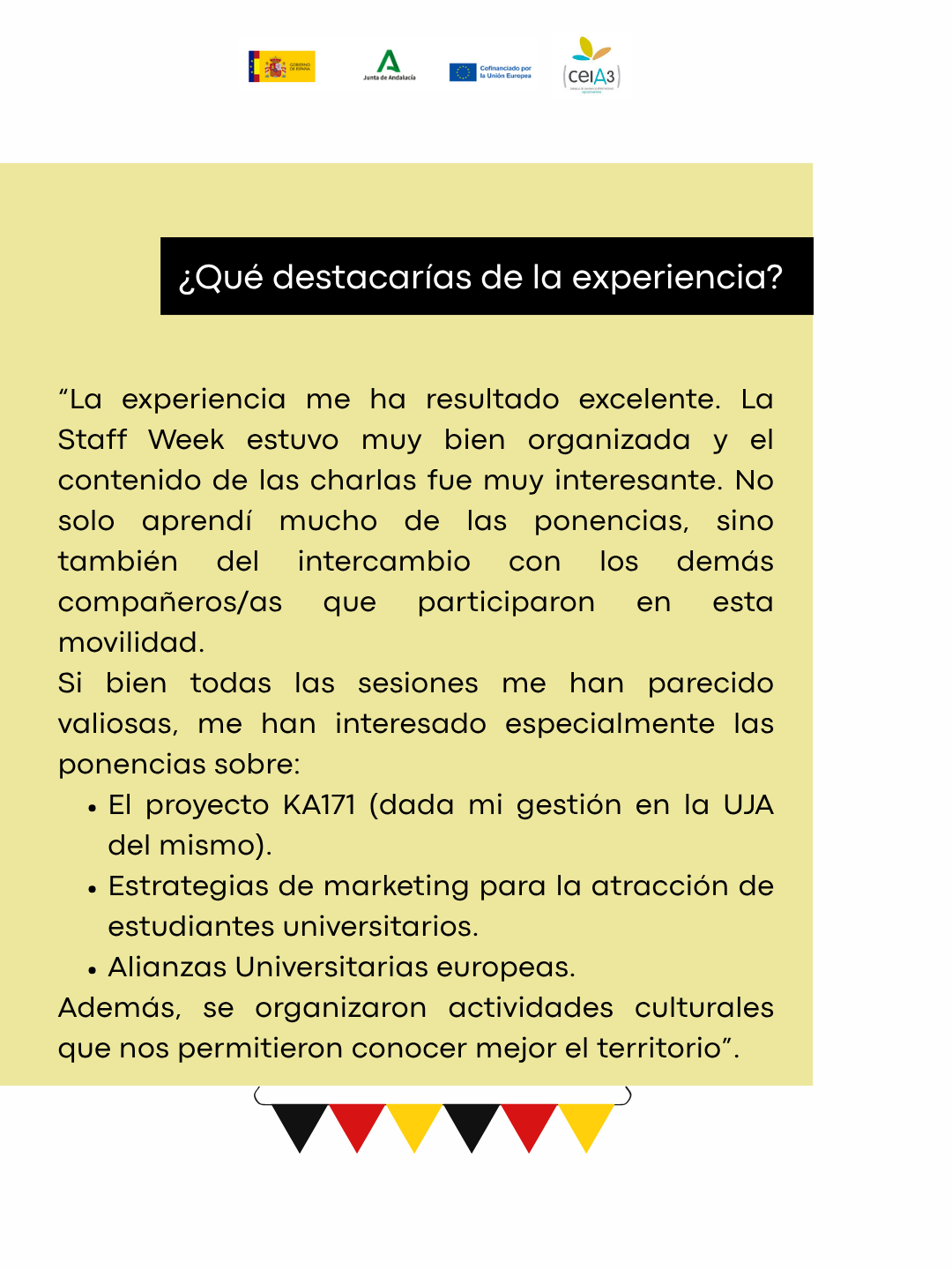 ¿Qué destacarías de la experiencia? La experiencia me ha resultado excelente. La Staff Week estuvo muy bien organizada y el contenido de las charlas fue muy interesante. No solo aprendí mucho de las ponencias, sino también del intercambio con los demás compañeros/as que participaron en esta movilidad.