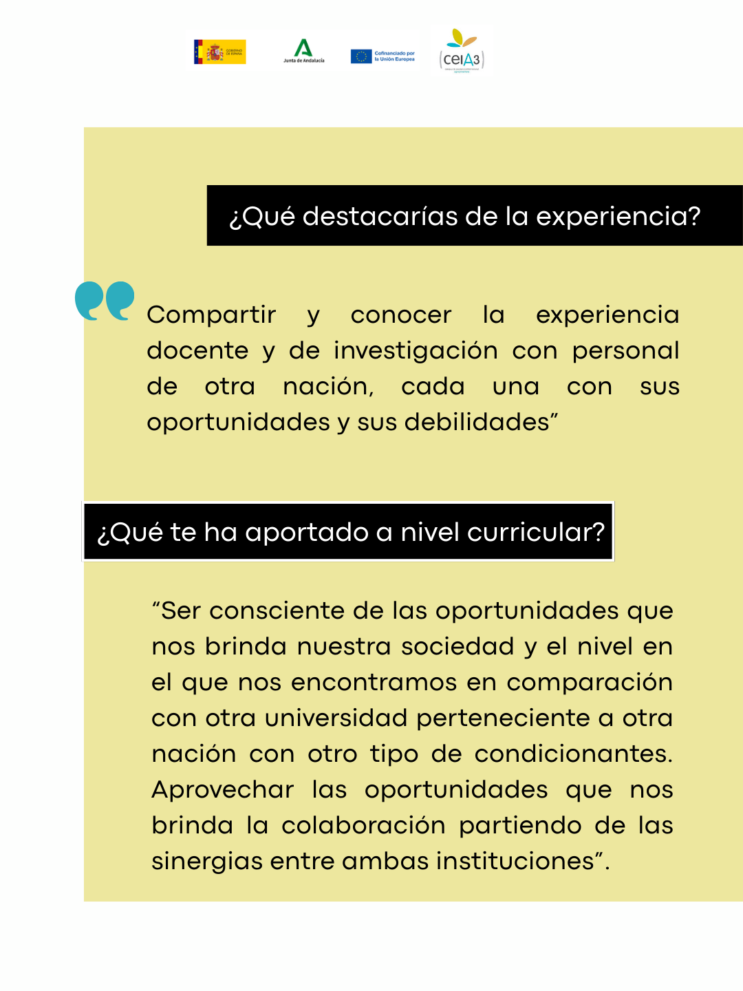 ¿Qué te ha aportado a nivel curricular? Ser consciente de las oportunidades que nos brinda nuestra sociedad y el nivel en el que nos encontramos en comparación con otra universidad perteneciente a otra nación con otro tipo de condicionantes. Aprovechar las oportunidades que nos brinda la colaboración partiendo de las sinergias entre ambas instituciones.