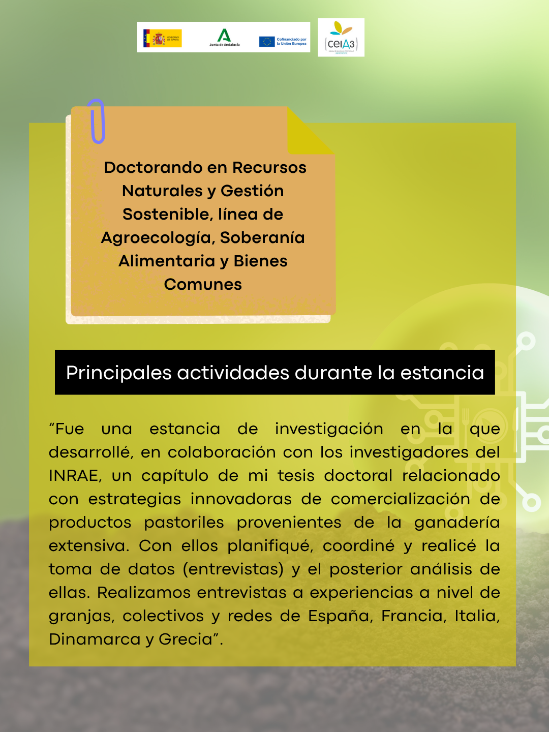 Principales actividades durante la estancia: Fue una estancia de investigación en la que desarrollé, en colaboración con los investigadores del INRAE, un capítulo de mi tesis doctoral, en Recursos Naturales y Gestión Sostenible, línea de Agroecología, Soberanía Alimentaria y Bienes Comunes, relacionado con estrategias innovadoras de comercialización de productos pastoriles provenientes de la ganadería extensiva. Con ellos planifiqué, coordiné y realicé la toma de datos (entrevistas) y el posterior análisis de ellas. Realizamos entrevistas a experiencias a nivel de granjas, colectivos y redes de España, Francia, Italia, Dinamarca y Grecia.