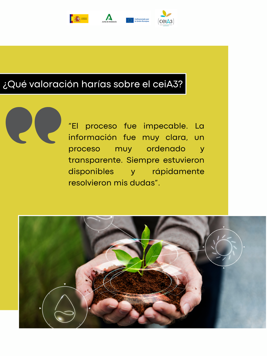 ¿Qué valoración harías sobre el ceiA3? El proceso fue impecable. La información fue muy clara, un proceso muy ordenado y transparente. Siempre estuvieron disponibles y rápidamente resolvieron mis dudas.
