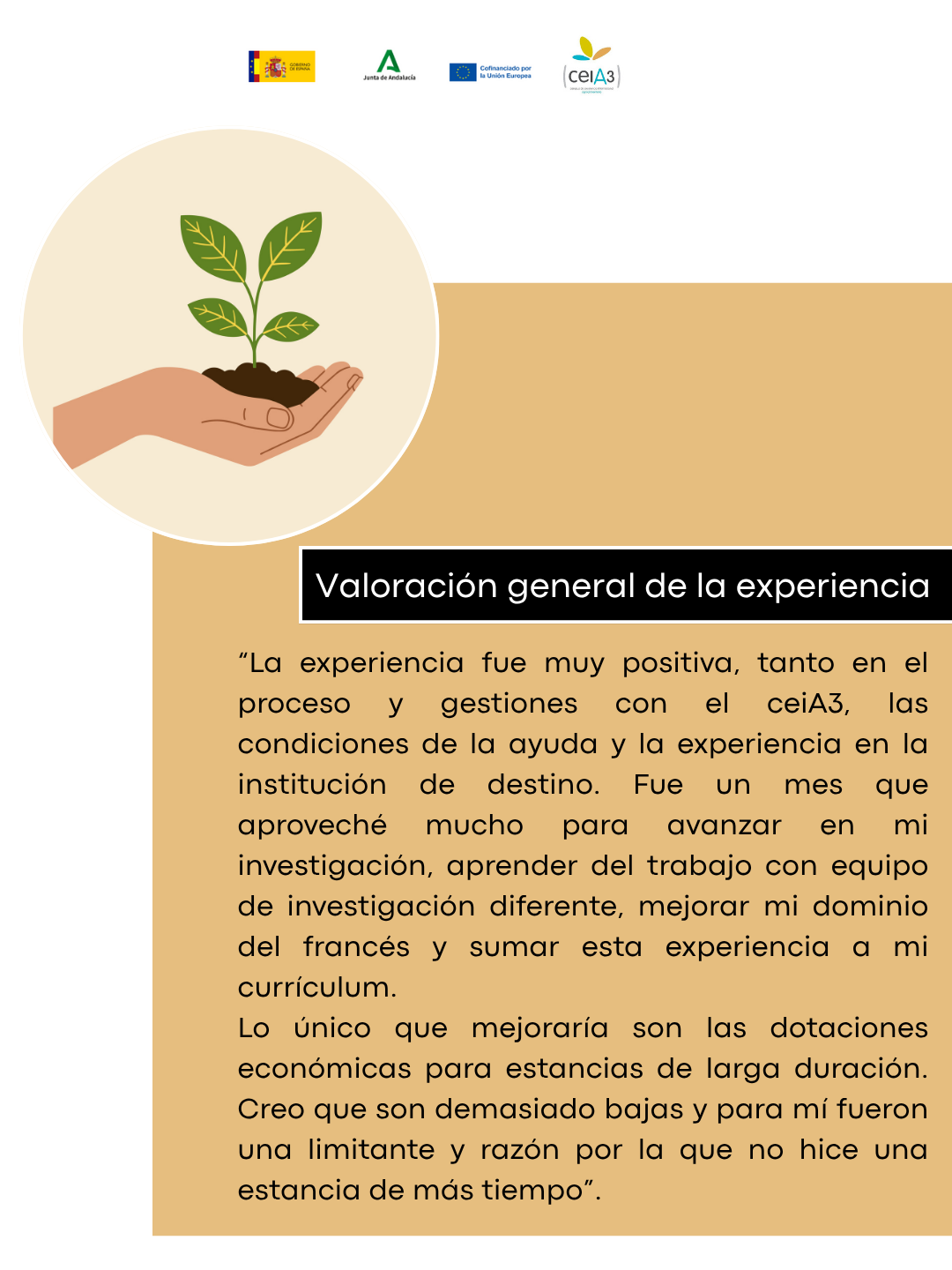 Lo único que mejoraría son las dotaciones económicas para estancias de larga duración. Creo que son demasiado bajas y para mí fueron una limitante y razón por la que no hice una estancia de más tiempo.