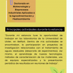 Principales actividades durante la estancia: Durante mi estancia tuve la oportunidad de trabajar en los laboratorios de la Universidad de Ulster, en Belfast. Dentro de mis actividades se encontraban, la participación en proyectos de investigación relacionados con el tratamiento de aguas residuales (desarrollo de experimentos). Así mismo, el aprendizaje de nuevas tecnologías, métodos de caracterización de los materiales, uso de equipos especializados y la presentación periódica de resultados en reuniones de trabajo.