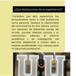 ¿Qué destacarías de la experiencia? Considero que esta experiencia fue enriquecedora tanto a nivel profesional como personal. Destaco la oportunidad de comunicarme en otro idioma, convivir con personas de diferentes partes del mundo, conocer diversas culturas y su cosmovisión. Además, el entorno académico y de investigación me permitió adaptarme a nuevos retos y explorar posibilidades muy valiosas para mi desarrollo profesional.