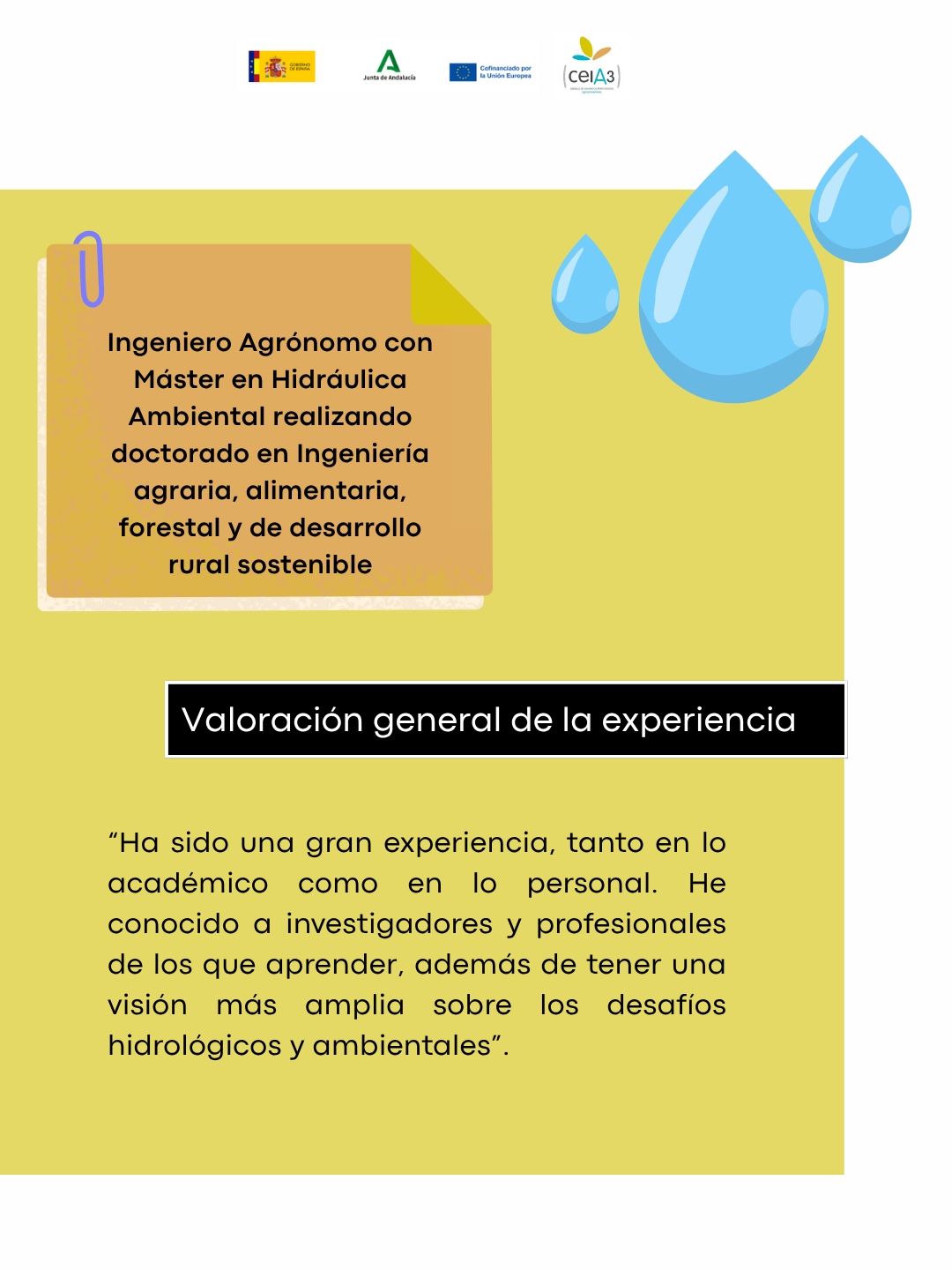 Valoración general de la experiencia: Ha sido una gran experiencia, tanto en lo académico como en lo personal. He conocido a investigadores y profesionales de los que aprender, además de tener una visión más amplia sobre los desafíos hidrológicos y ambientales.