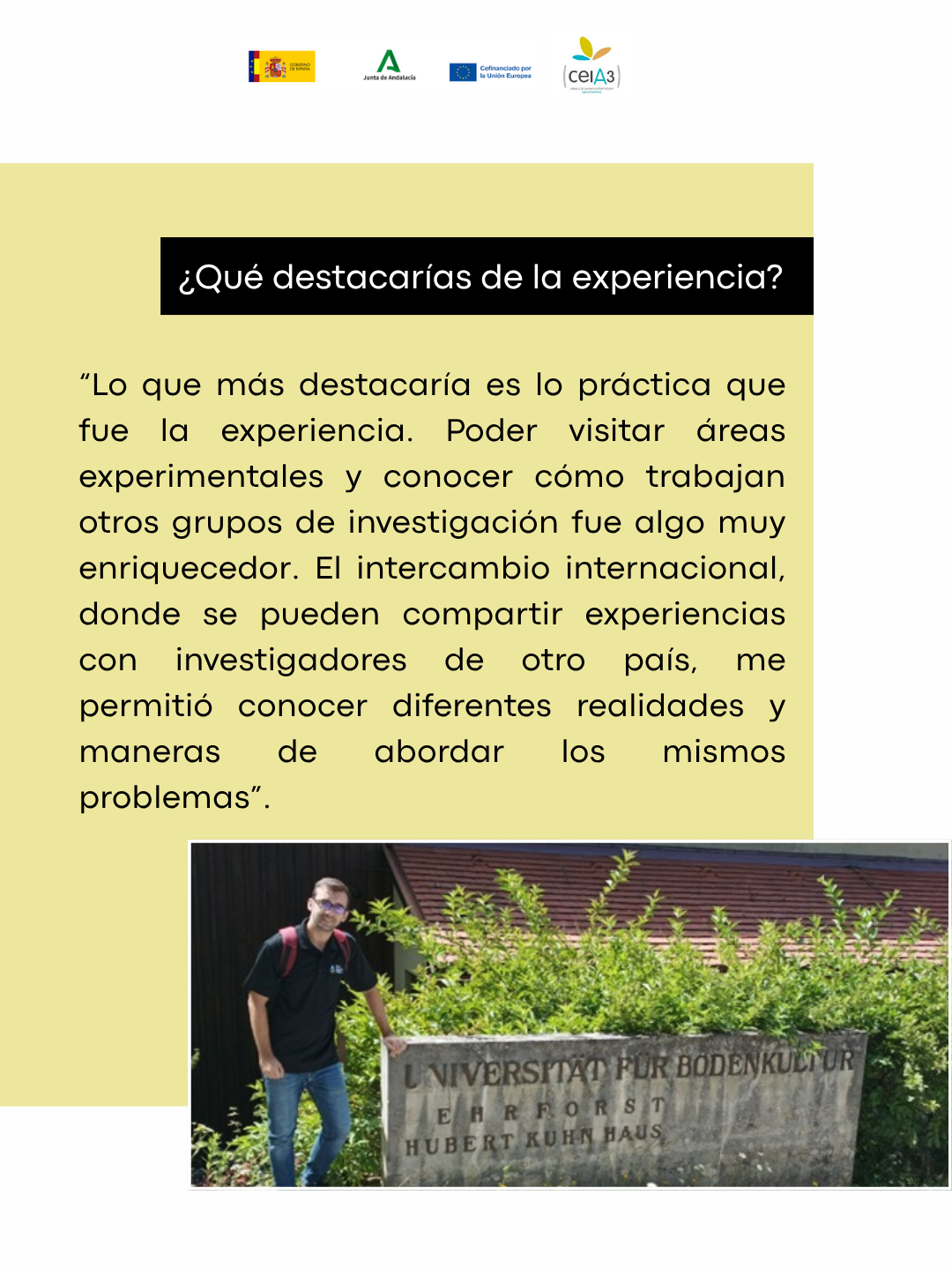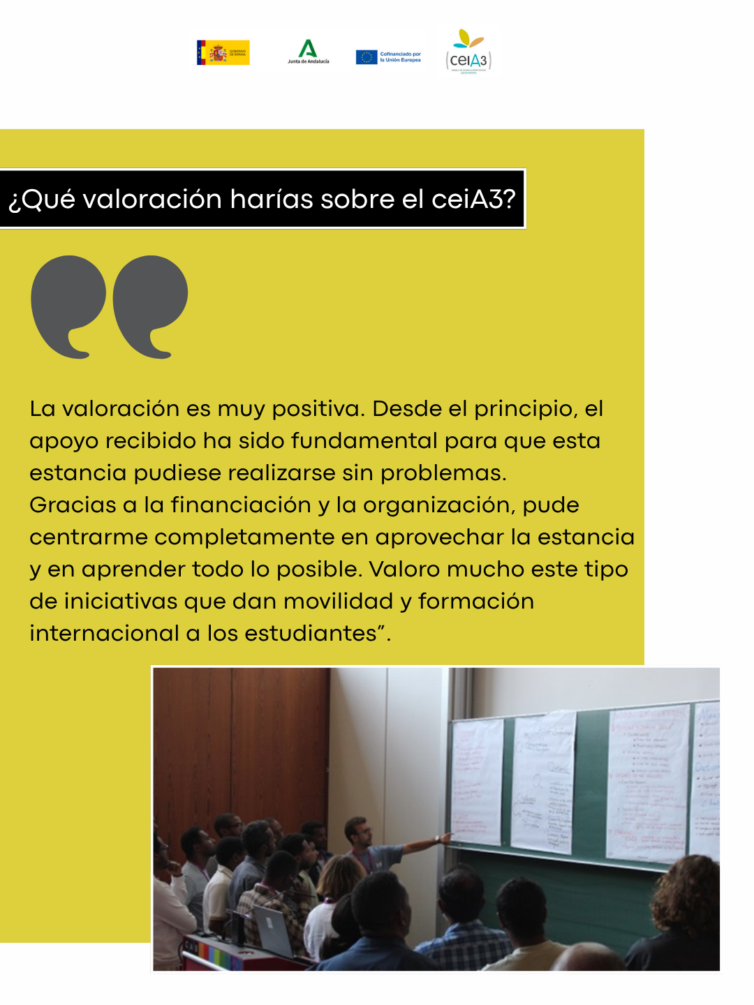 ¿Qué valoración harías sobre el ceiA3? La valoración es muy positiva. Desde el principio, el apoyo recibido ha sido fundamental para que esta estancia pudiese realizarse sin problemas. Gracias a la financiación y la organización, pude centrarme completamente en aprovechar la estancia y en aprender todo lo posible. Valoro mucho este tipo de iniciativas que dan movilidad y formación internacional a los estudiantes.