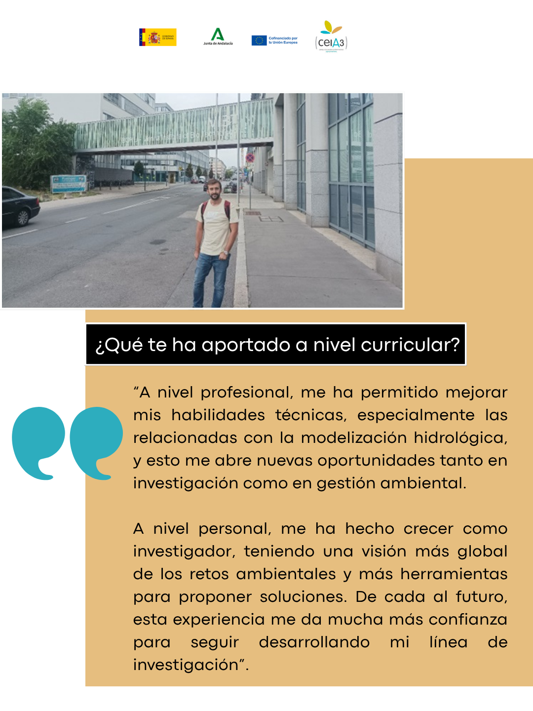 ¿Qué te ha aportado a nivel curricular? A nivel profesional, me ha permitido mejorar mis habilidades técnicas, especialmente las relacionadas con la modelización hidrológica, y esto me abre nuevas oportunidades tanto en investigación como en gestión ambiental.