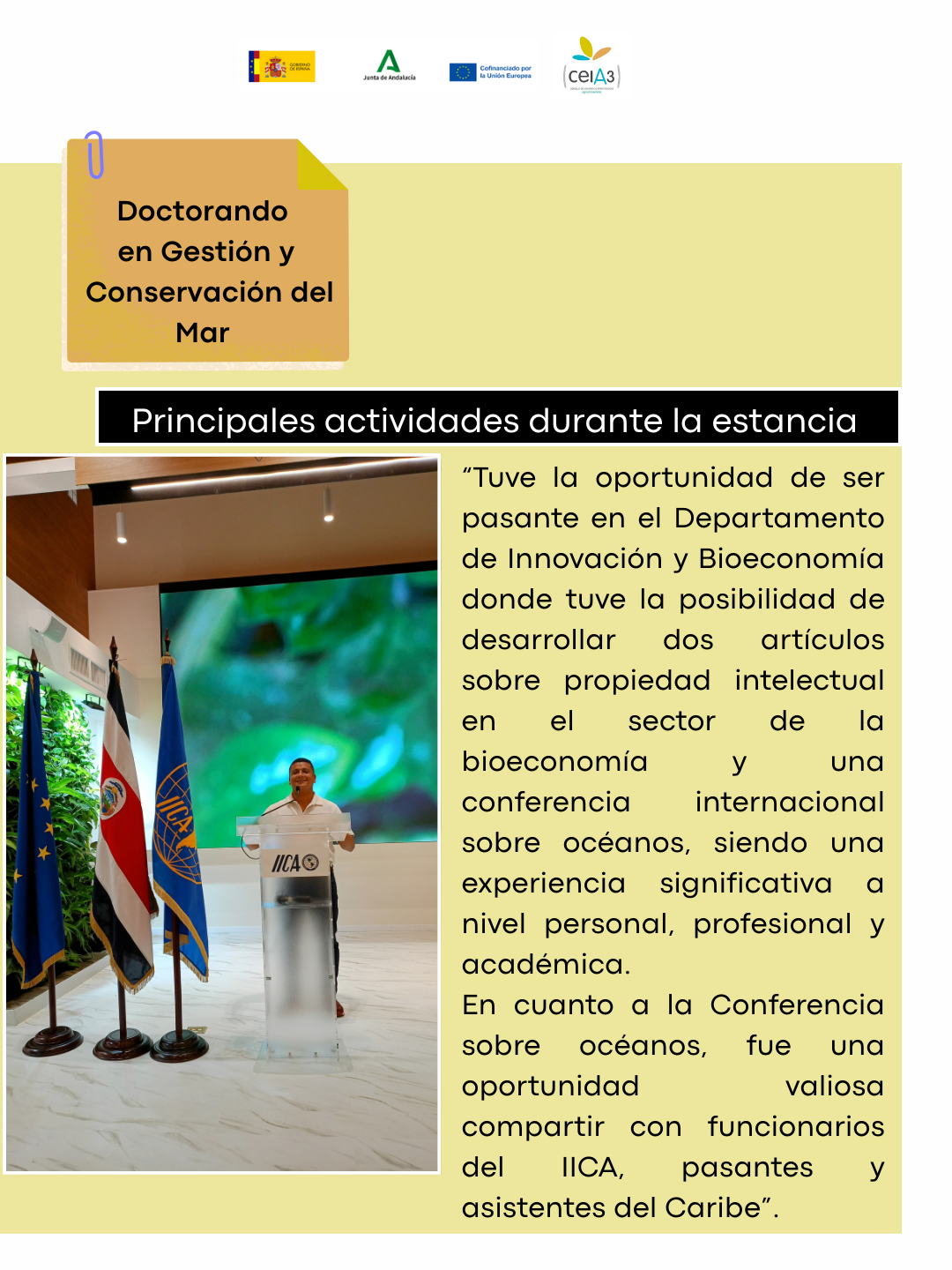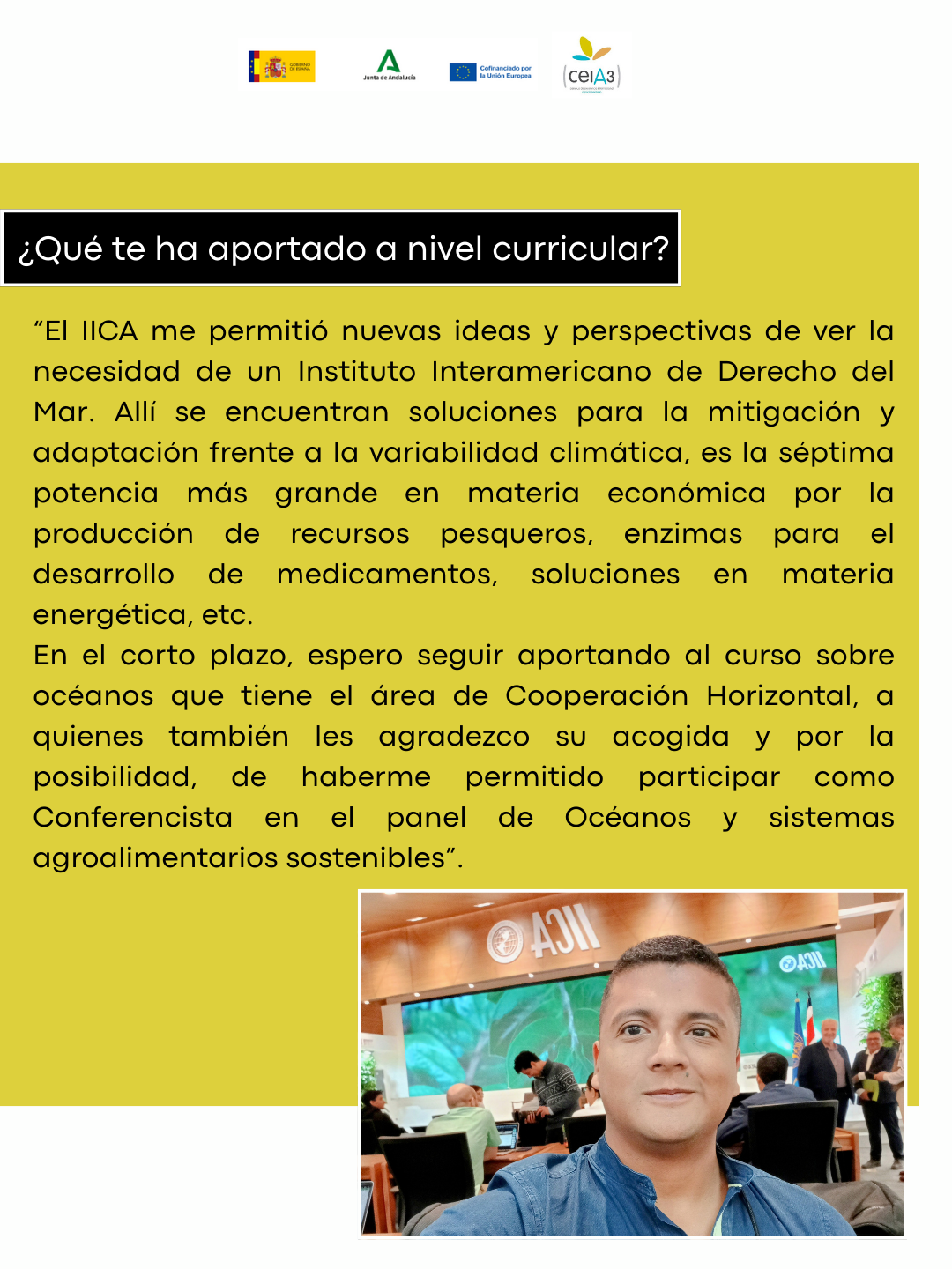 ¿Qué te ha aportado a nivel curricular? El IICA me permitió nuevas ideas y perspectivas de ver la necesidad de un Instituto Interamericano de Derecho del Mar, como una posibilidad a futuro para avanzar en el ODS 14 con nuevas perspectivas de investigación, ya que el océano no debe verse como un sumidero de plásticos, ni de residuos. Allí se encuentran soluciones para la mitigación y adaptación frente a la variabilidad climática, es la séptima potencia más grande en materia económica por la producción de recursos pesqueros, enzimas para el desarrollo de medicamentos, soluciones en materia energética, etc.
