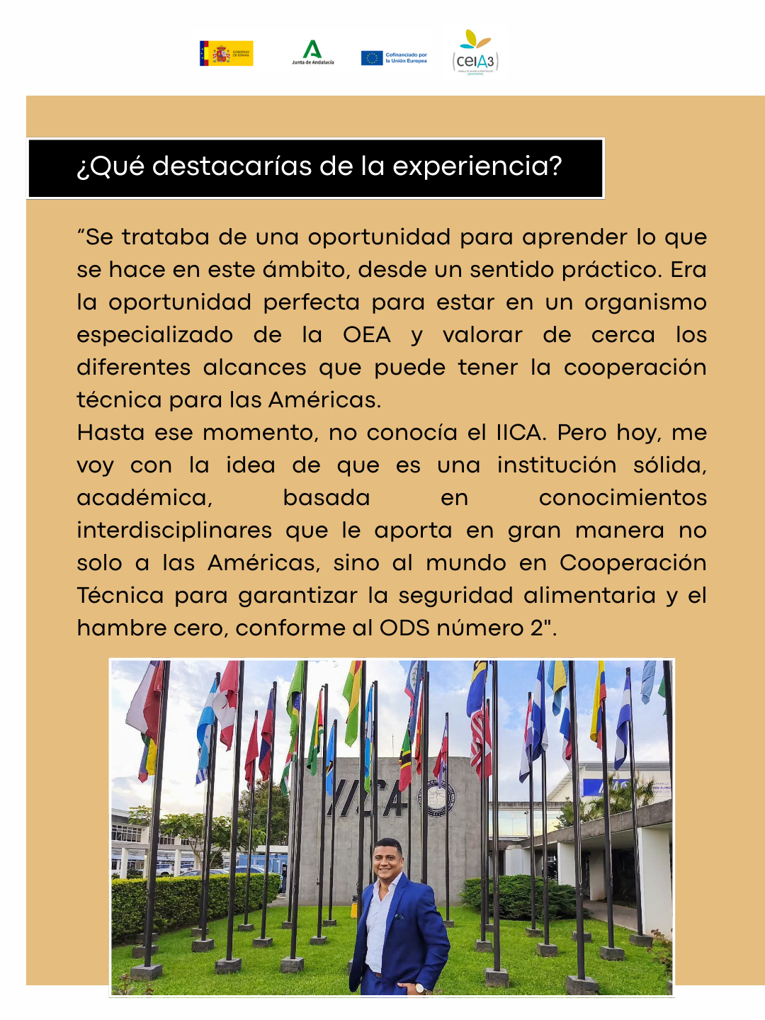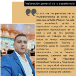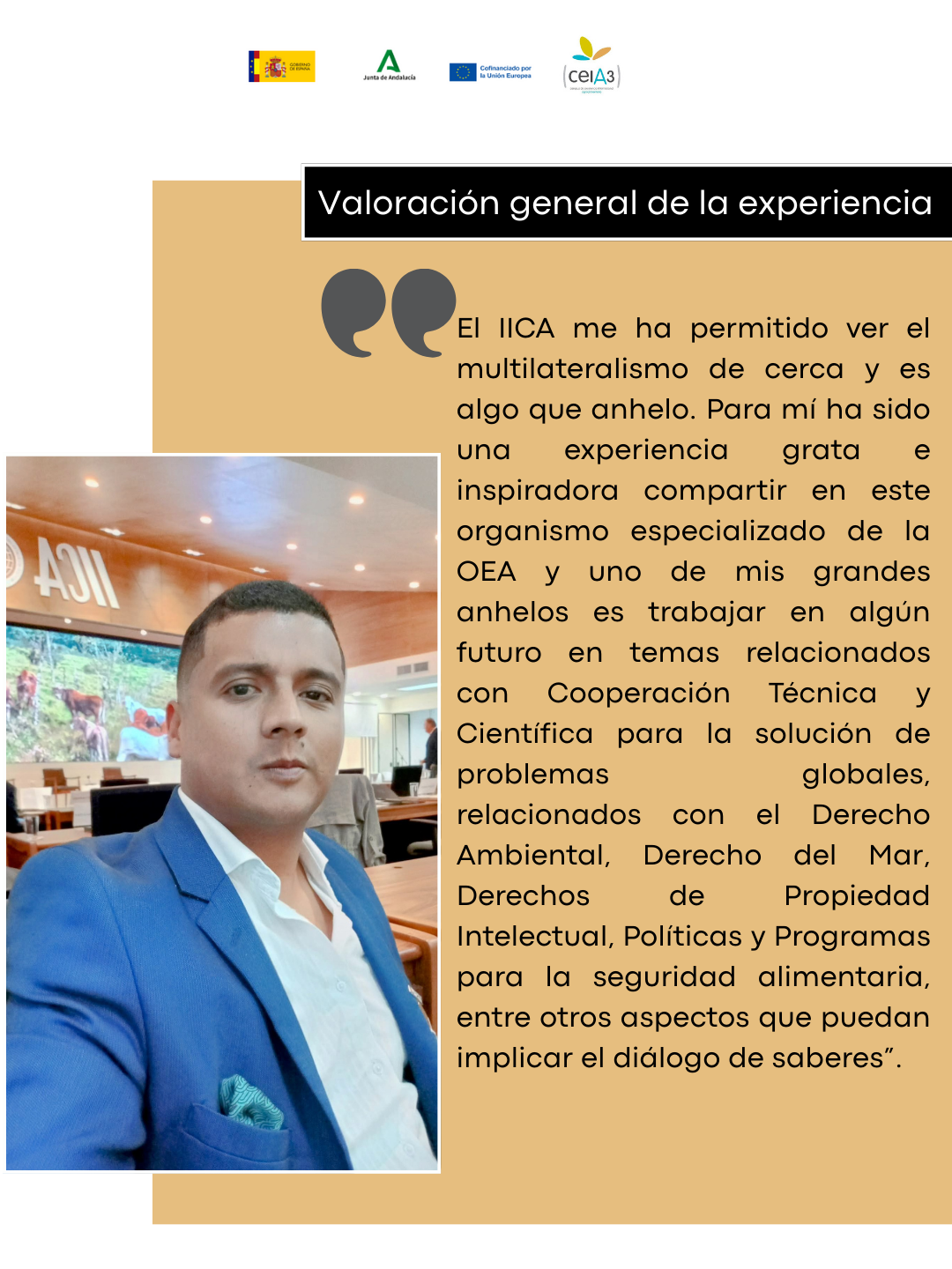 Valoración general de la experiencia: El IICA me ha permitido ver el multilateralismo de cerca y es algo que anhelo. Para mí ha sido una experiencia grata e inspiradora compartir en este organismo especializado de la OEA y uno de mis grandes anhelos es trabajar en algún futuro en temas relacionados con Cooperación Técnica y Científica para la solución de problemas globales, relacionados con el Derecho Ambiental, Derecho del Mar, Derechos de Propiedad Intelectual, Políticas y Programas para la seguridad alimentaria, entre otros aspectos que puedan implicar el diálogo de saberes.