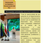 Principales actividades durante la estancia: Tuve la oportunidad de ser pasante en el Departamento de Innovación y Bioeconomía donde tuve la posibilidad de desarrollar dos artículos sobre propiedad intelectual en el sector de la bioeconomía y una conferencia internacional sobre océanos, siendo una experiencia significativa a nivel personal, profesional y académica.