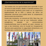¿Qué destacarías de la experiencia? Se trataba de una oportunidad para aprender lo que se hace en este ámbito, desde un sentido práctico. Era la oportunidad perfecta para estar en un organismo especializado de la OEA y valorar de cerca los diferentes alcances que puede tener la cooperación técnica para las Américas.