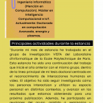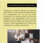 ¿Qué destacarías de la experiencia? Destacaría el excelente ambiente de trabajo del grupo VISTA y la oportunidad de reencontrarme con investigadores con los que ya había colaborado en mi estancia anterior. Ha sido una experiencia muy enriquecedora tanto a nivel profesional como personal, que me ha permitido fortalecer vínculos, afianzar la colaboración con el grupo y seguir aprendiendo de un entorno de investigación muy activo y de alto nivel.