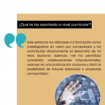 ¿Qué te ha aportado a nivel curricular? Esta estancia ha reforzado mi formación como investigadora en visión por computador y ha contribuido directamente al desarrollo de mi tesis doctoral. Además, me ha permitido consolidar colaboraciones internacionales, avanzar en una publicación conjunta y abrir la posibilidad de futuras estancias o proyectos compartidos.