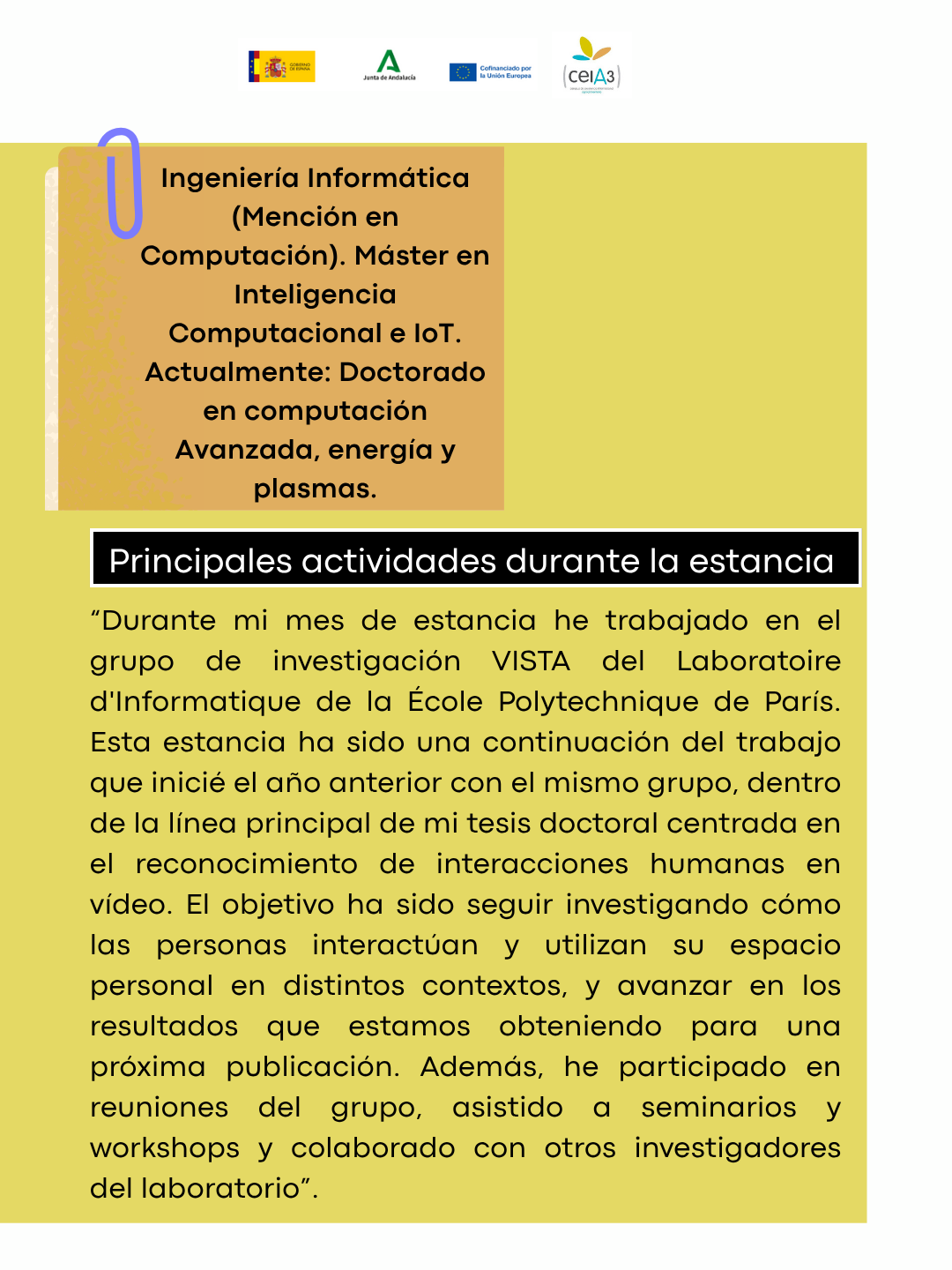 Principales actividades durante la estancia: Durante mi mes de estancia he trabajado en el grupo de investigación VISTA del Laboratoire d’Informatique de la École Polytechnique de París. Esta estancia ha sido una continuación del trabajo que inicié el año anterior con el mismo grupo, dentro de la línea principal de mi tesis doctoral centrada en el reconocimiento de interacciones humanas en vídeo. El objetivo ha sido seguir investigando cómo las personas interactúan y utilizan su espacio personal en distintos contextos, y avanzar en los resultados que estamos obteniendo para una próxima publicación. Además, he participado en reuniones del grupo, asistido a seminarios y workshops y colaborado con otros investigadores del laboratorio.