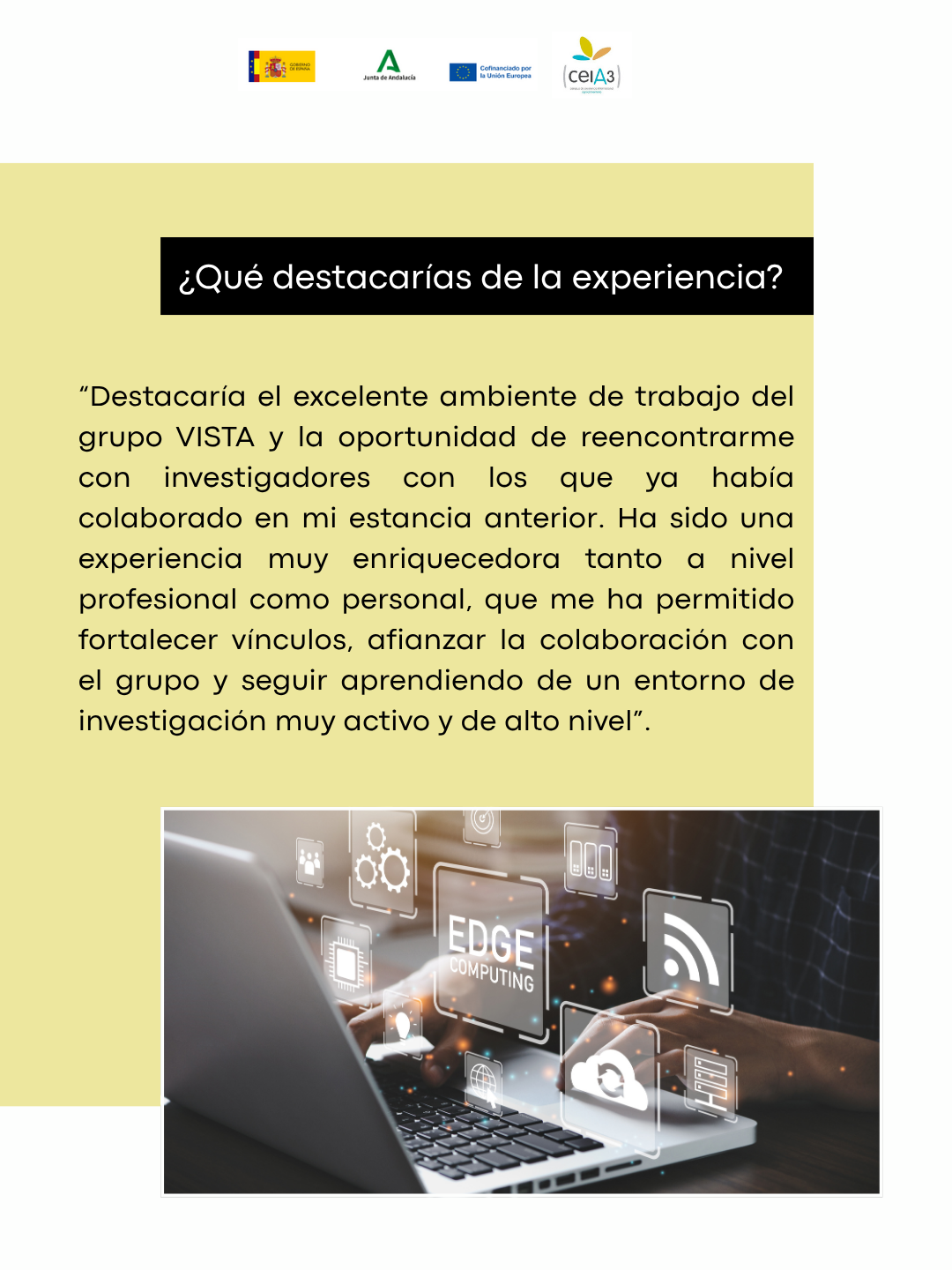 ¿Qué destacarías de la experiencia? Destacaría el excelente ambiente de trabajo del grupo VISTA y la oportunidad de reencontrarme con investigadores con los que ya había colaborado en mi estancia anterior. Ha sido una experiencia muy enriquecedora tanto a nivel profesional como personal, que me ha permitido fortalecer vínculos, afianzar la colaboración con el grupo y seguir aprendiendo de un entorno de investigación muy activo y de alto nivel.