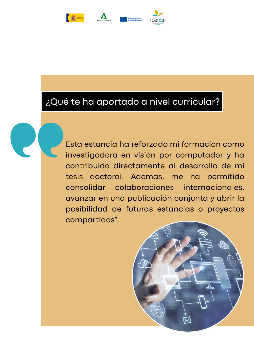¿Qué te ha aportado a nivel curricular? Esta estancia ha reforzado mi formación como investigadora en visión por computador y ha contribuido directamente al desarrollo de mi tesis doctoral. Además, me ha permitido consolidar colaboraciones internacionales, avanzar en una publicación conjunta y abrir la posibilidad de futuras estancias o proyectos compartidos.