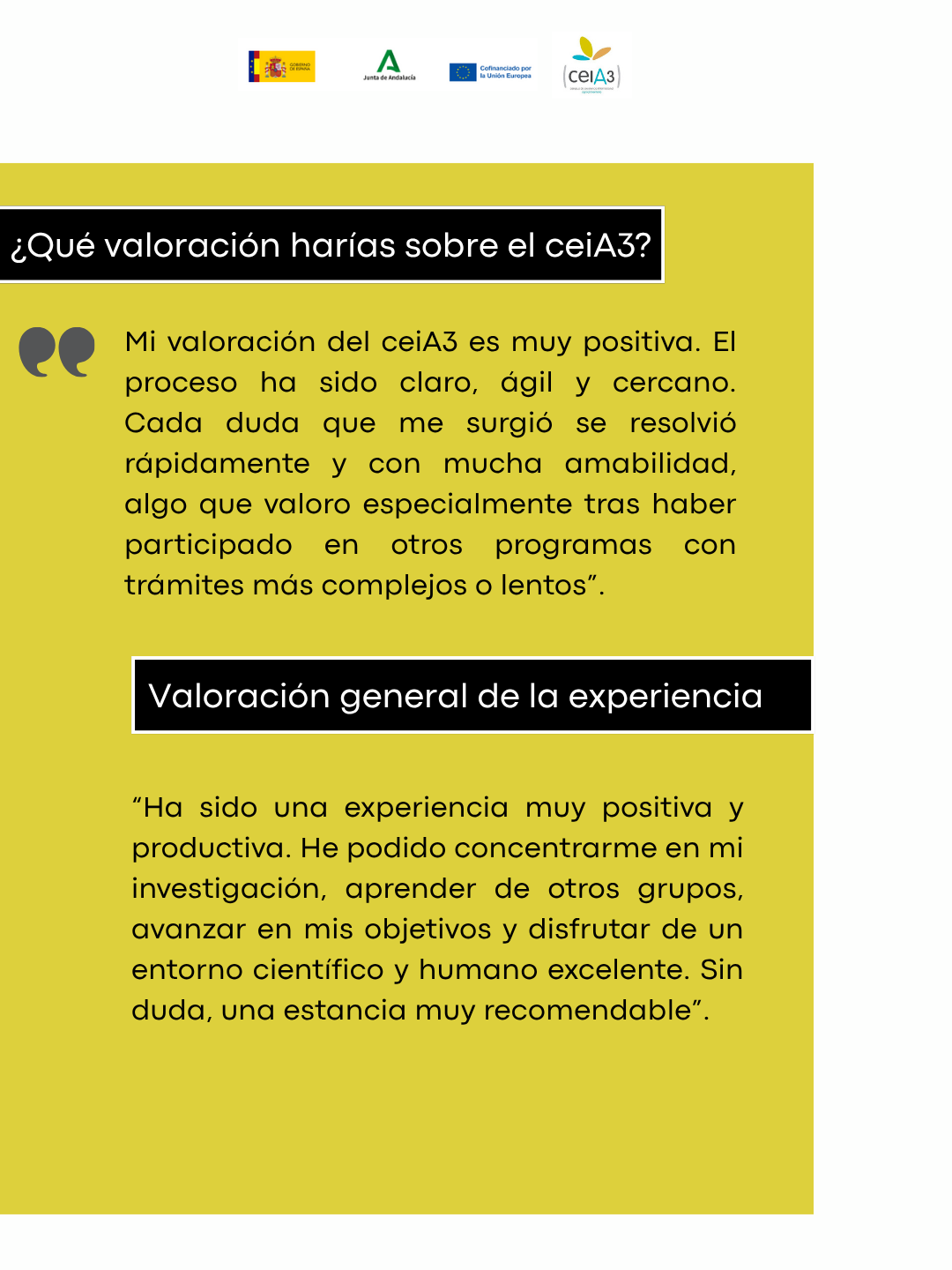 ¿Qué valoración harías sobre el ceiA3? Mi valoración del ceiA3 es muy positiva. El proceso ha sido claro, ágil y cercano. Cada duda que me surgió se resolvió rápidamente y con mucha amabilidad, algo que valoro especialmente tras haber participado en otros programas con trámites más complejos o lentos.