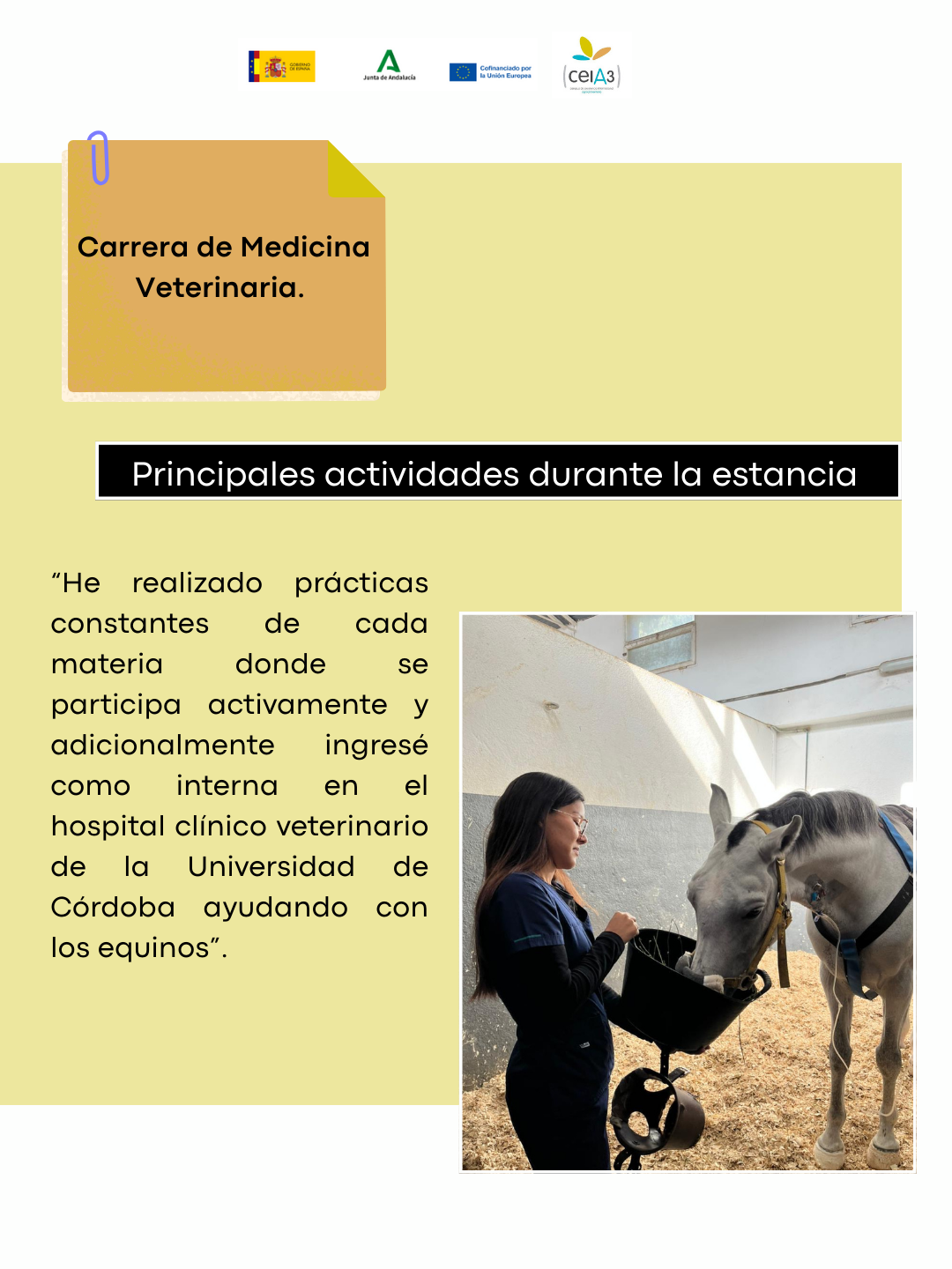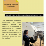 Principales actividades durante la estancia: Prácticas constantes de cada materia donde se participa activamente y adicionalmente ingresé como interna en el hospital clínico veterinario de la Universidad de Córdoba ayudando con los equinos.