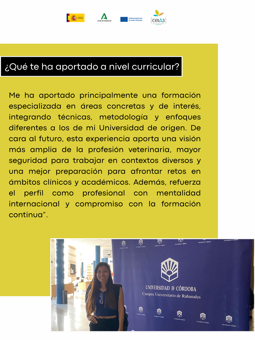 ¿Qué te ha aportado a nivel curricular? Me ha aportado principalmente una formación especializada en áreas concretas y de interés, integrando técnicas, metodología y enfoques diferentes a los de mi Universidad de origen. De cara al futuro, esta experiencia aporta una visión más amplia de la profesión veterinaria, mayor seguridad para trabajar en contextos diversos y una mejor preparación para afrontar retos en ámbitos clínicos y académicos. Además, refuerza el perfil como profesional con mentalidad internacional y compromiso con la formación continua.