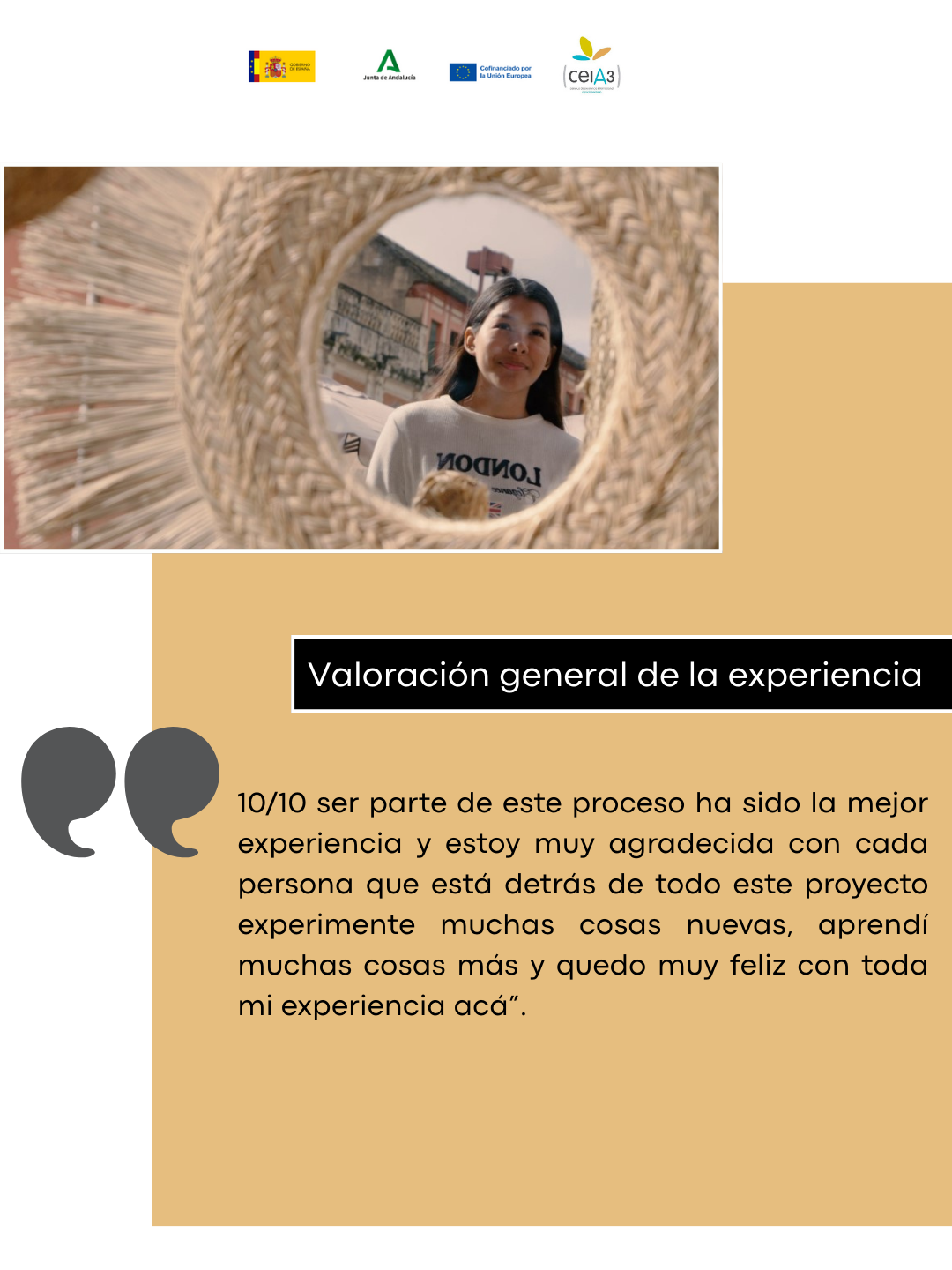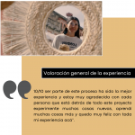 Valoración general de la experiencia: 10/10 ser parte de este proceso ha sido la mejor experiencia y estoy muy agradecida con cada persona que está detrás de todo este proyecto, experimenté muchas cosas nuevas, aprendí muchas cosas más y quedo muy feliz con toda mi experiencia acá.