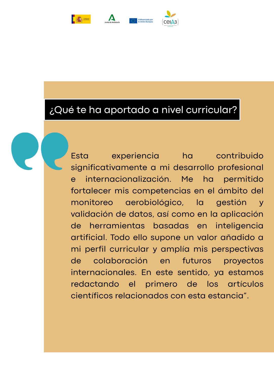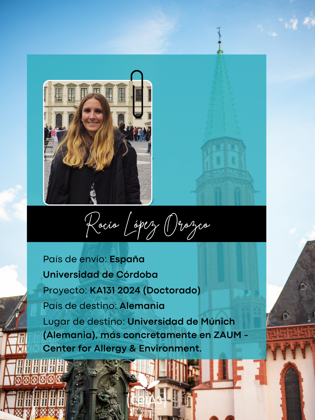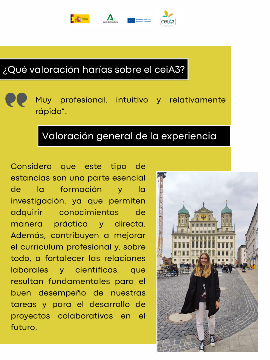 ¿Qué valoración harías sobre el ceiA3? Mi valoración sobre el ceiA3 y el proceso es muy positiva, facilitaron todo el desarrollo de la estancia. Considero que el programa ofrece una excelente oportunidad para fomentar la movilidad y la internacionalización.