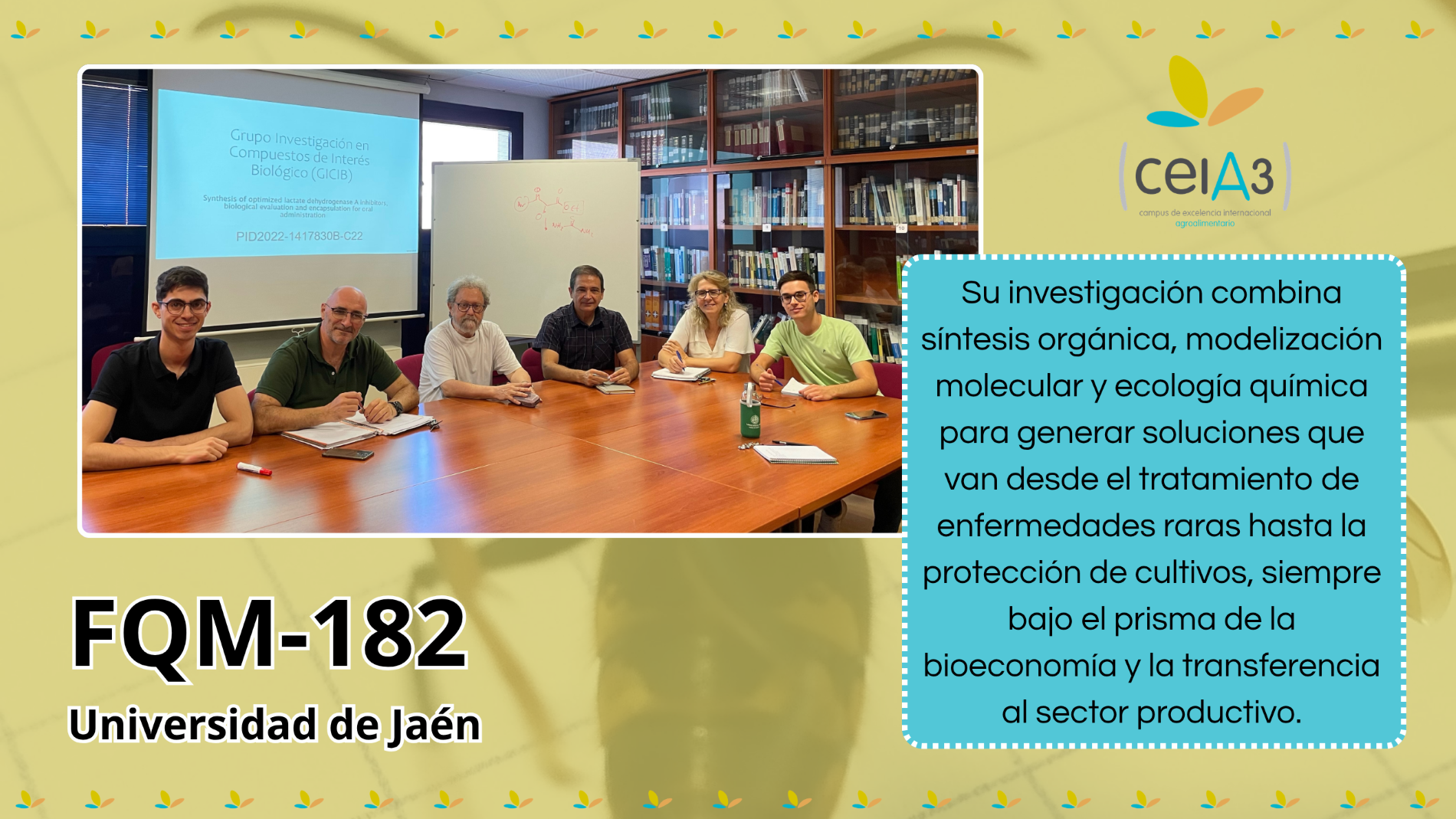 Desde el diseño y síntesis de compuestos orgánicos con potencial farmacológico hasta el desarrollo de estrategias sostenibles para el control de plagas, el Grupo de investigación en compuestos de interés biológico FQM-182 de la Universidad de Jaén sitúa la química en el centro de la innovación biomédica y ambiental. Su investigación combina síntesis orgánica, modelización molecular y ecología química para generar soluciones que van desde el tratamiento de enfermedades raras hasta la protección de cultivos, siempre bajo el prisma de la bioeconomía y la transferencia al sector productivo.