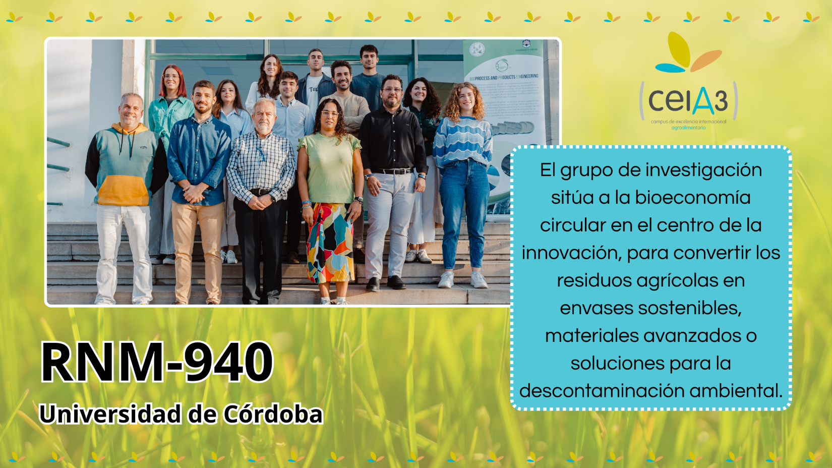 Desde la valorización de biomasa hasta el desarrollo de nuevos bioprocesos y materiales funcionales, el grupo Bioprocesos e Ingeniería de Productos | RNM-940 de la Universidad de Córdoba sitúa a la bioeconomía circular en el centro de la innovación, para convertir los residuos agrícolas en envases sostenibles, materiales avanzados o soluciones para la descontaminación ambiental, con un claro compromiso con la transferencia tecnológica y el desarrollo rural.